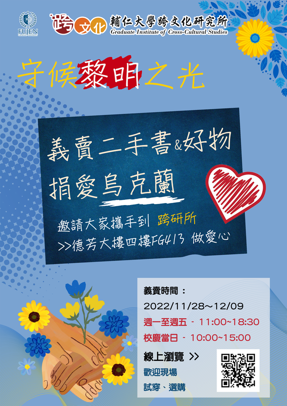 輔仁大學跨文化研究所在十一月二十八號到十二月九號舉辦 「義賣二手書&好物 捐愛烏克蘭」活動」,期盼可以透過二手義賣募資金費捐贈烏克蘭,除了可以達到永續在利用的價值也能傳遞愛。