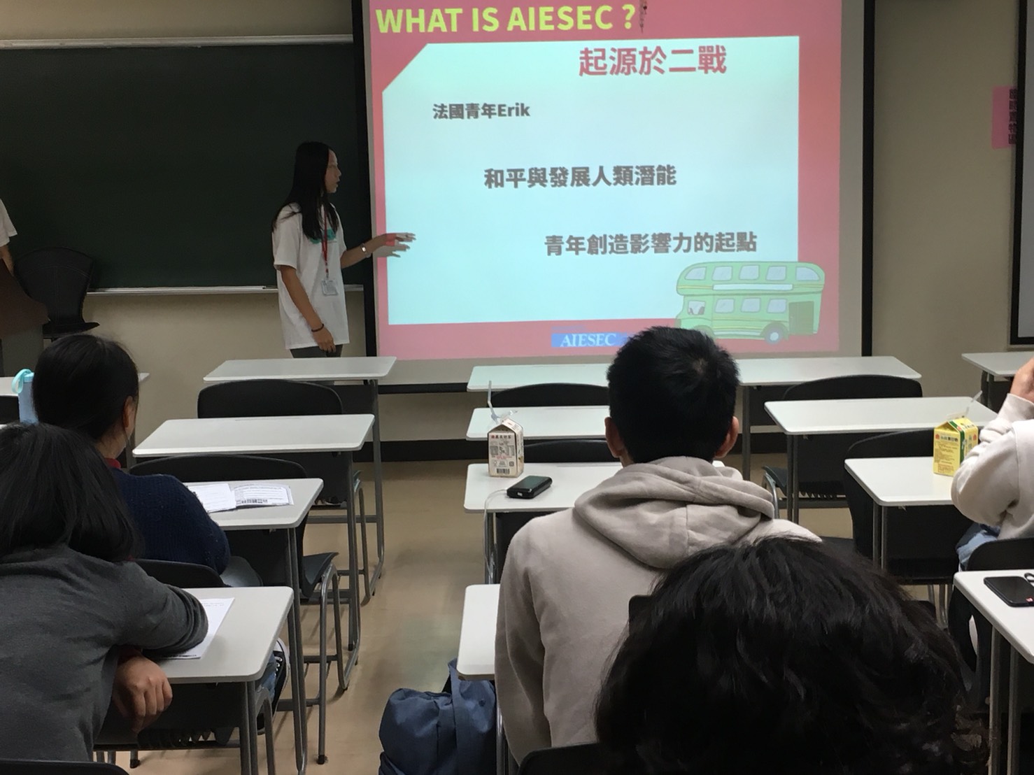 青年領導力培訓平台國際經濟商管學生會AIESEC十月三十一號在國璽樓舉行海外成長說明會,請來歸國研習生分享國外志工經驗。運動管理學系一年級的陳彥瑜表示,參加海外成長的專案可以與世界各地的人交流,並了解文化差異,彼此溝通、包容。