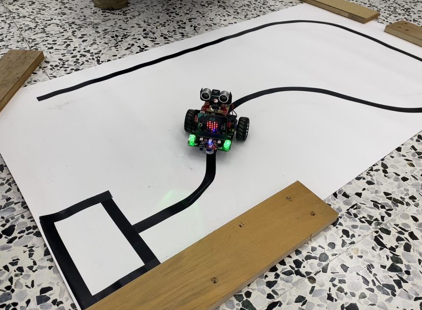 課程前半段讓學生們了解積木程式語言的基本操作,並讓微型電腦開發版做出相對應的指令,例如:感測環境溫度與亮度、計算步數等。後半段開始對自走車下達指令,並根據情況進行修正,所有參與同學都順利的讓自走車到達終點。