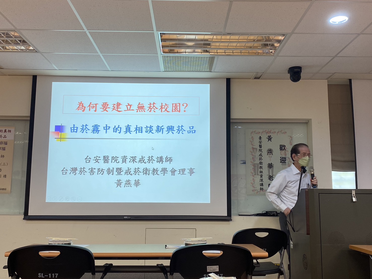 輔仁大學學生事務處衛生保健組五月八號與臺安醫院在羅耀拉大樓合辦菸害防制專題講座活動,邀請身為臺安醫院資深戒菸講師與台灣菸害防制暨戒菸衛教學會理事的黃燕華老師向師生們宣導菸害防制相關議題。