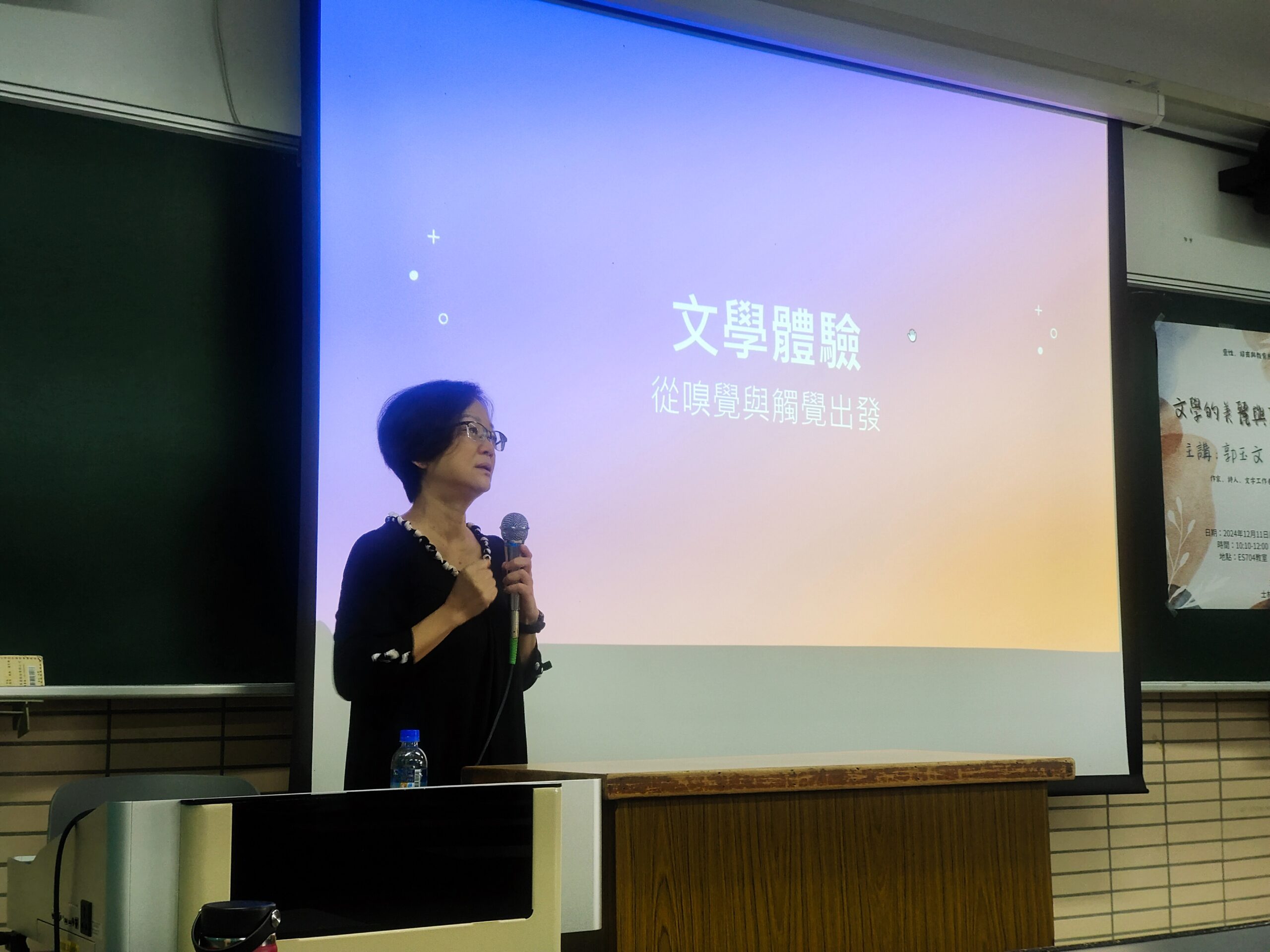 輔仁大學天主教學術研究院士林哲學研究中心十二月十一號在進修部大樓舉辦「文學的美麗與哀愁」專題講座。講座中,郭玉文女士設計體驗活動,讓參與者透過觸摸道具及嗅聞精油等方式啟發感官,並進行即興創作。她指出,優秀的文學作品源於全身心的投入,將平面敘述轉化為立體的感受。