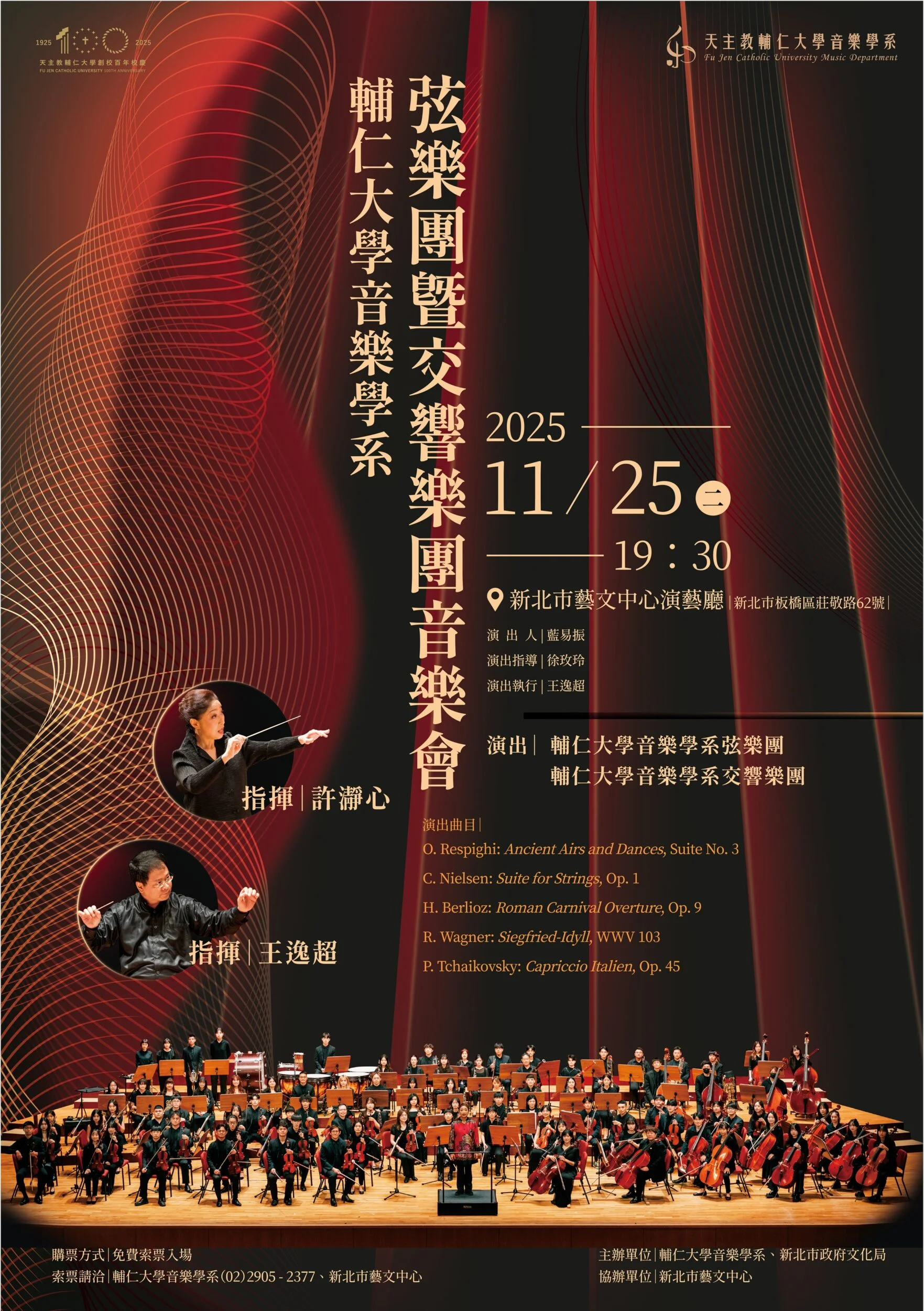 輔仁大學音樂學系十一月二十五號在新北市藝文中心演藝廳,舉辦弦樂團暨交響樂團音樂會,由音樂系系主任王逸超教授與許瀞心教授指揮,帶領音樂系的學生聯合獻演多首經典之作,感受從優雅古典到熱情浪漫的音樂色彩,呈現輔大音樂系豐碩的教學成果,也一同祝福輔仁大學百年弦歌不輟、永世風華,為校慶寫下充滿音樂與感動的篇章。
