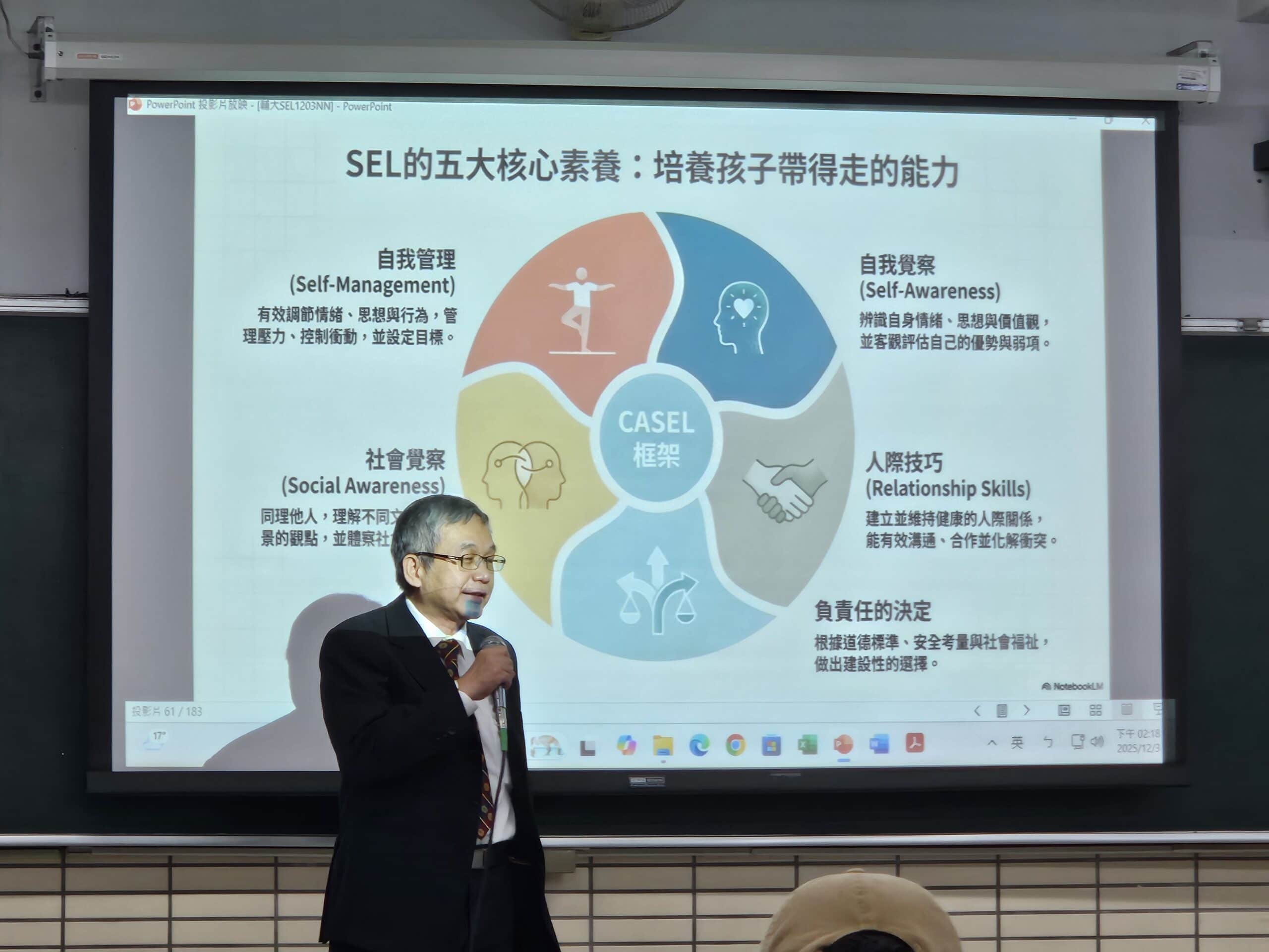 輔仁大學宿舍服務中心十二月三號在進修部舉辦「所以愛會消失對不對?」社會情緒學習與非暴力溝通學習講座,邀請到台灣師範大學教育心理與輔導學系教授陳學志主講。陳學志在講座中透過實作活動引導學員覺察與辨識自身情緒,並說明社會情緒學習的意義,包括認識與管理情緒、同理他人與建立良好人際關係。談及面對負面情緒的策略,陳學志建議先接納情緒、找出成因,轉換為旁觀者角色;並強調適時表達需求及每日記錄心情,有助於自我覺察與找出心情低落的來源。