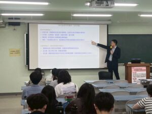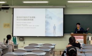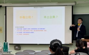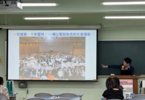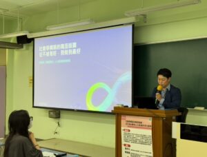 講座中的第二位講者劉毓翔學長現任京城集團學習與發展專案經理,專責員工訓練、職涯發展與潛力人才培育等策略與執行。他以「職涯的可能性不在起點,而在於你怎麼認知這段路」作為演講開頭,講述自己起初進入行業時從不被看好,到透過曾經在工廠人員大規模流失的情況下,短時間內補齊人力的親身經歷,進一步指出職涯中的「非常時刻」是支撐個人在職場中繼續前行的重要力量,也讓他確認了自己的價值所在。而社會學對他最大的幫助,在於解構對方問題背後的含義,並掌握對話中的脈絡。