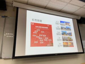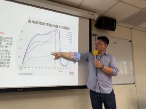 林文正向學生們展示他過去對中國旅遊之於臺灣人影響的研究。他提到,旅遊活動一直以來都是中國對臺灣統戰的重要策略之一,目標是在拉近台灣民眾對中國的感知文化距離,意旨對中國文化上的認同感。接著他也根據過往的研究結果指出,前往中國旅遊其實並不會對臺灣人的意識型態有著明顯的影響,因此我們「也許」暫且不需要擔心去中國旅遊對臺灣文化的影響。