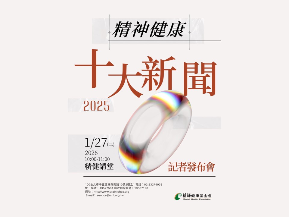 2026年1月27號,精神健康基金會在其精健講堂舉辦「2025 全國社會十大新聞事件」票選結果發表記者發布會。精神健康基金會邀請國立台灣大學醫學院名譽教授胡海國教授、國防醫學院臨床教授楊聰財教授、台大醫院精神醫學部特聘兼任主治醫師黃宗正醫師和台灣大學醫學院精神科教授陳錫中教授等諸多專家學者對精神健康基金會與民眾共同票選出來的2025全國社會十大新聞事件進行評論和建議。這場記者會旨在透過醫界、基金會與媒體的跨域對話,試圖將社會大眾對負面新聞的「關心」,轉化為一套可運作的預防系統。