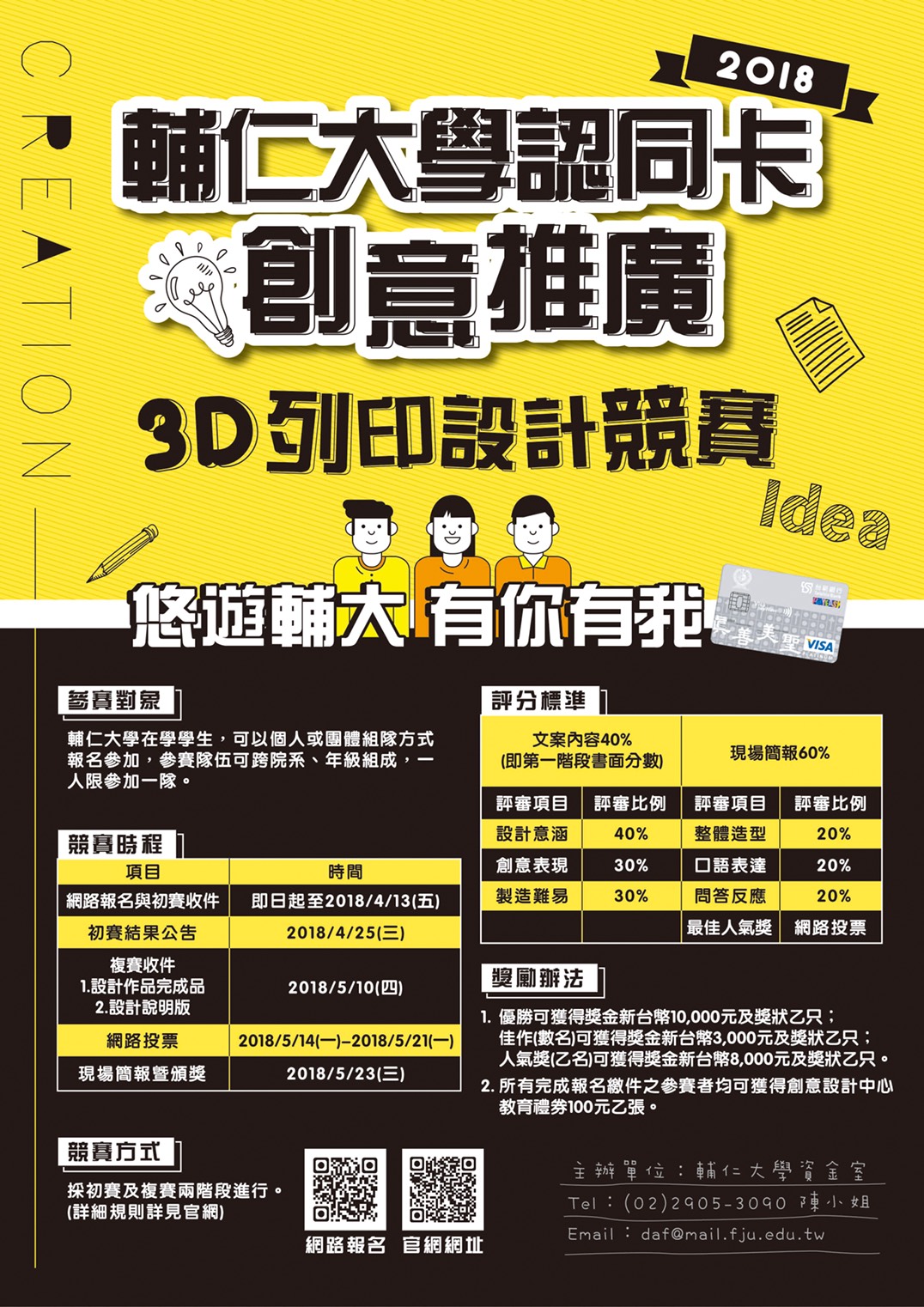 輔仁大學舉辦第四屆「認同卡創意推廣競賽」,資金室主任陳杰昇表示,今年的競賽方式會與創意設計中心合作,參賽的同學要設計出具有輔大專屬特色與精神的3D作品來推廣認同卡,也期望學生在設計的同時能更認識輔大認同卡。