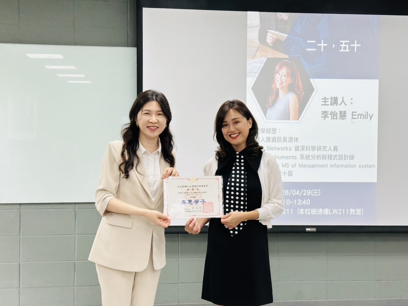 輔仁大學資訊管理學系四月二十九號在樹德樓舉辦「二十,五十」系友講座,邀請畢業系友李怡慧分享職涯經驗。透過在美國深造和就業的故事,鼓勵學生勇敢表達想法、主動爭取機會,面對困難的任務時也要勇於挑戰。